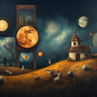A surreal landscape features a quaint church amidst vibrant, otherworldly planets and framed celestial scenes. The scenery blends nature with imaginative elements, evoking a dreamlike atmosphere.