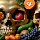 Prompt: Laughing skulls with rotten, gappy teeth, made of fruits and vegetables, potatoes, herbs, by Giuseppe Arcimboldo, Igor Morski, Jean-Baptiste Monge