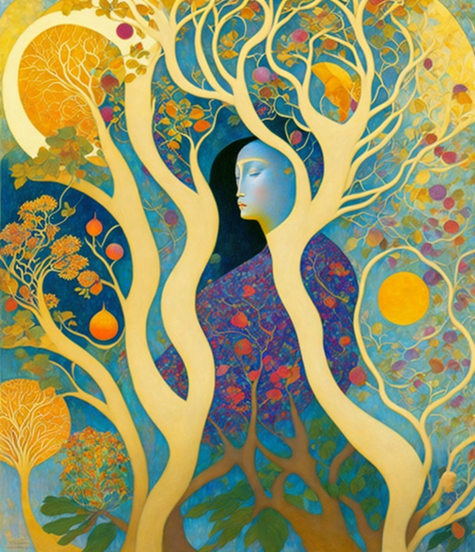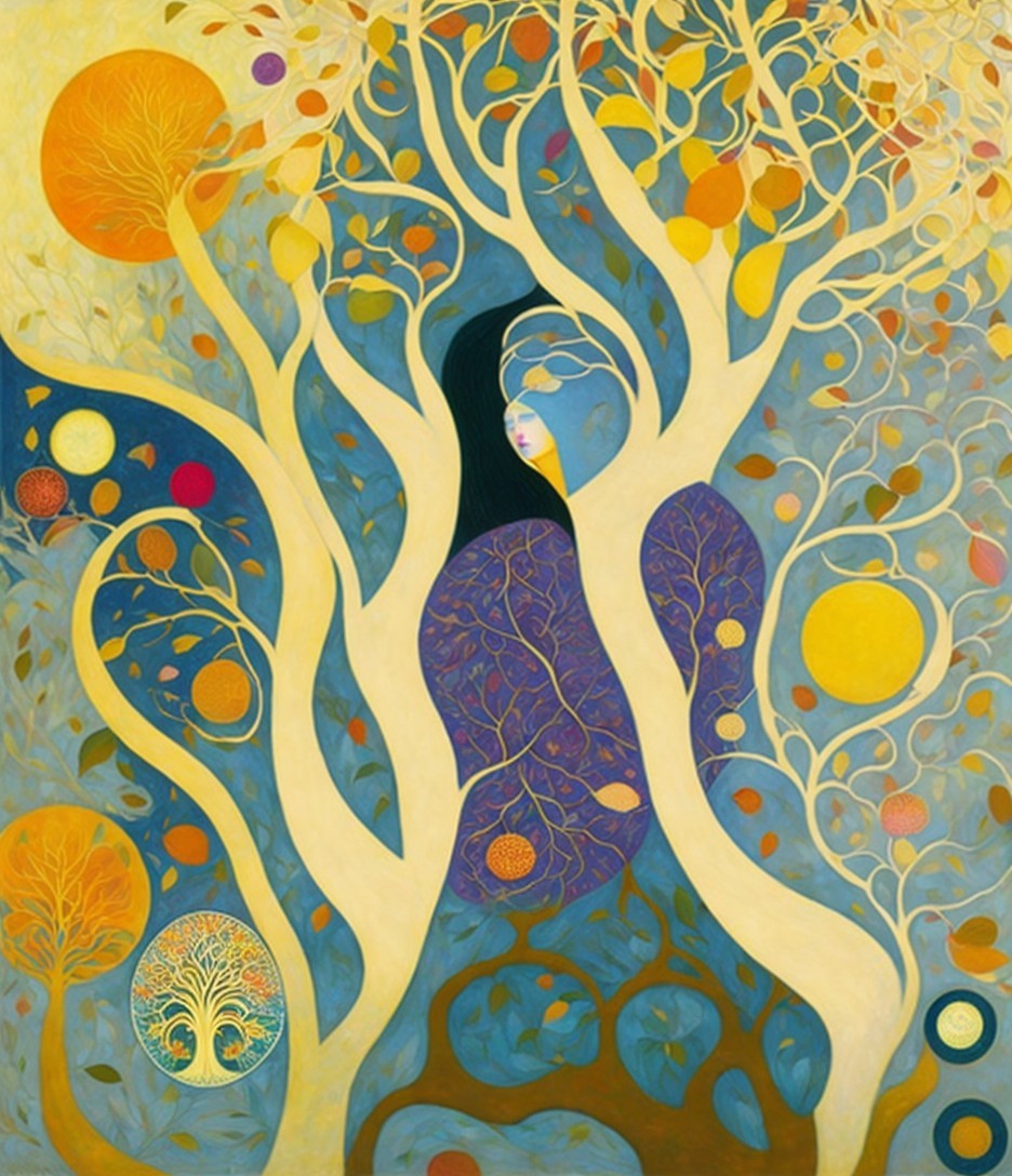 An artwork with a stylized woman blended into a tree with golden branches and round colorful fruits, against a blue and gold mosaic background.