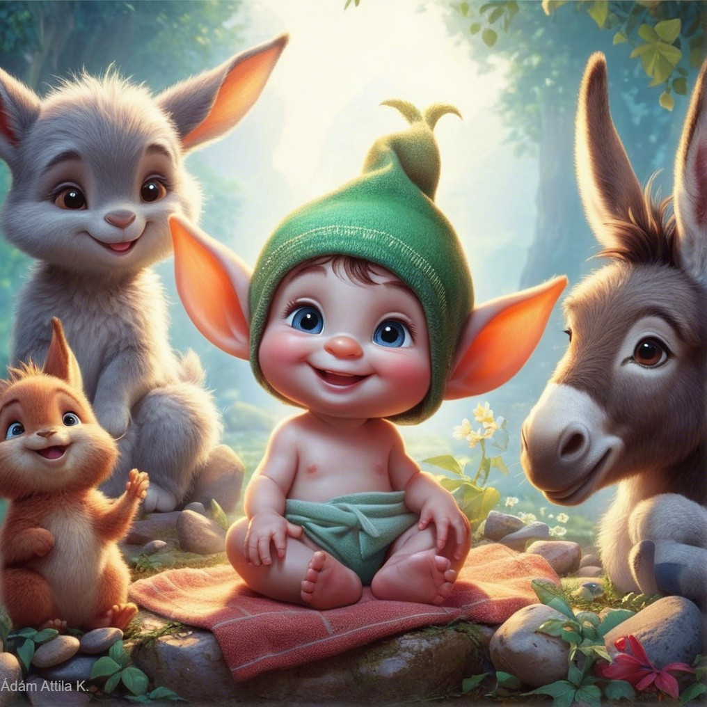 In a cheerful picture, a little elf sits smiling on a towel placed on the ground and stones, next to him are his lovely, long-eared friends, including a little donkey.