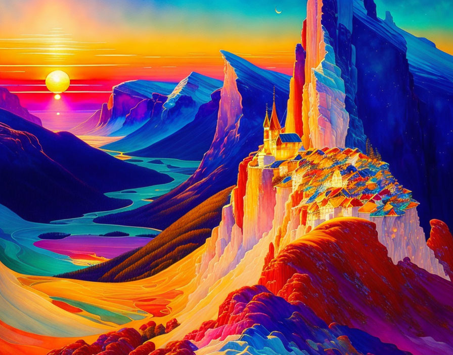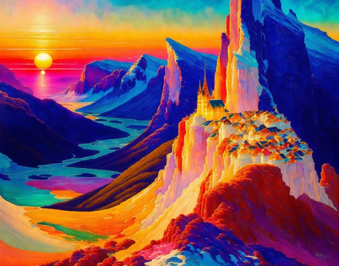 A vivid, colorful fantasy landscape with a castle perched on cliffs overlooking snaking rivers and mountains against a sunset.