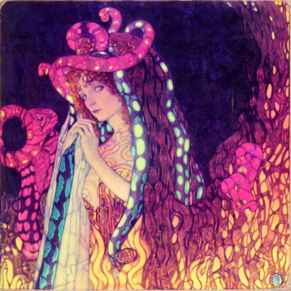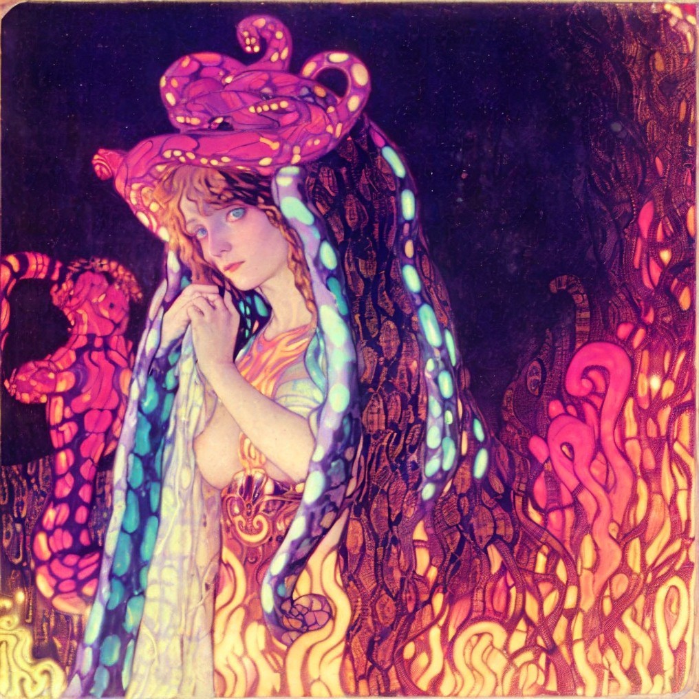 Art Nouveau style illustration of woman with flowing hair entwined by colorful sea creature in intricate background