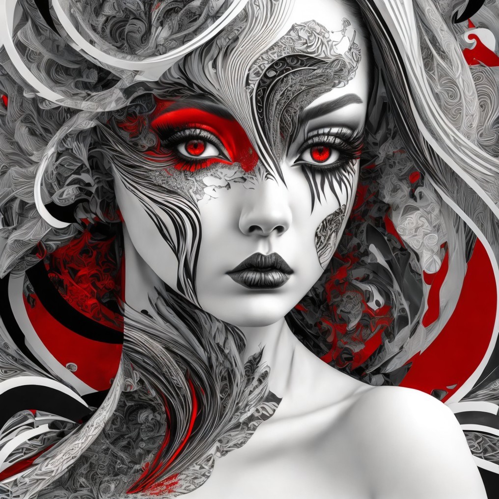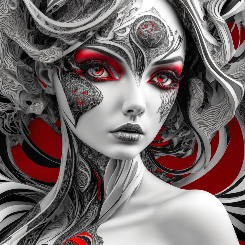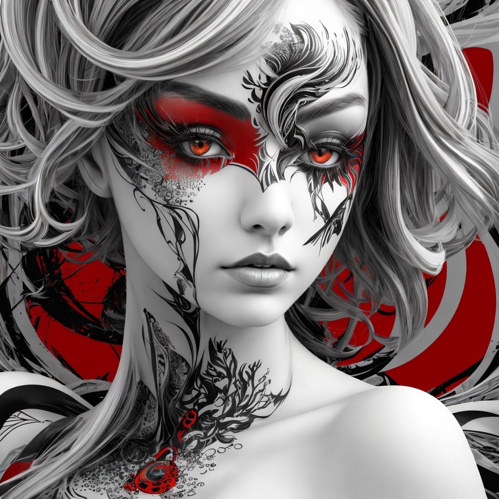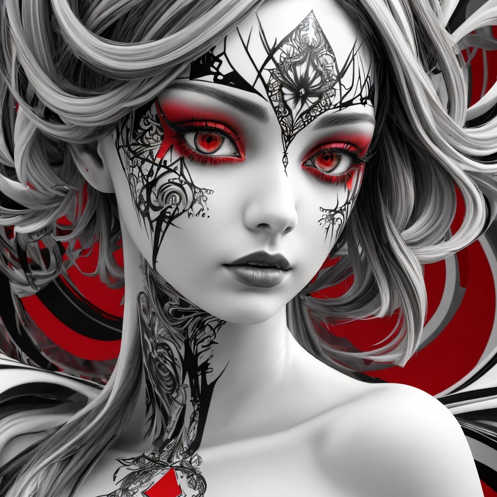 A digital artwork of a woman with striking red eyes, monochrome skin, and intricate black and red facial patterns resembling tribal or cybernetic designs.