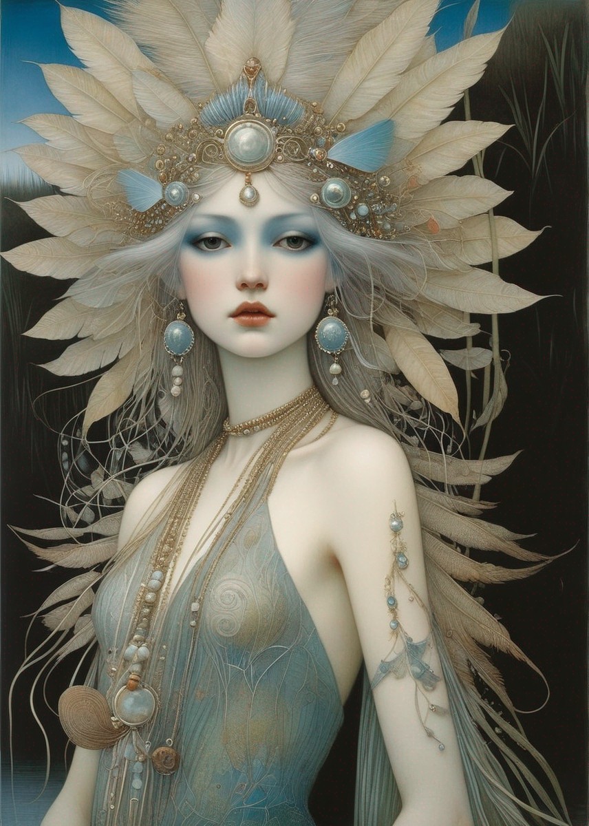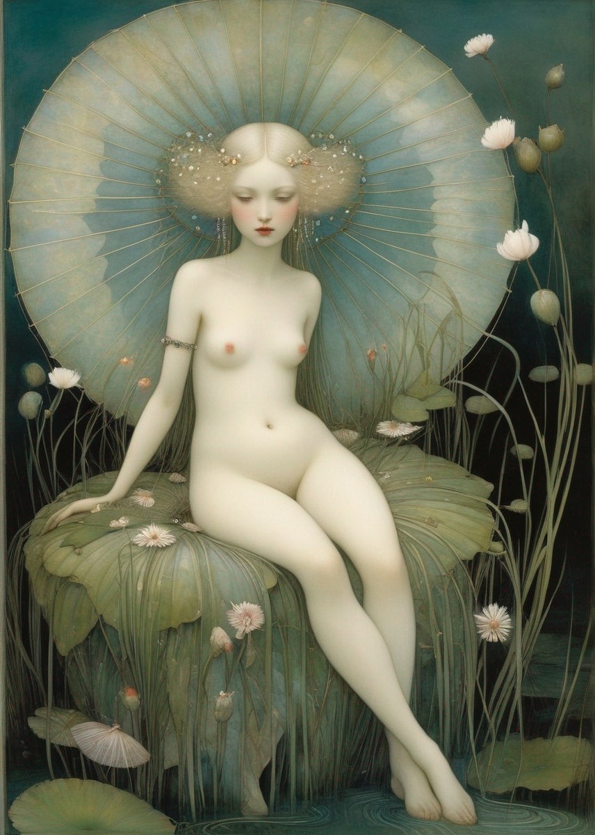 Pale-skinned figure in ornate white gown by glowing mushrooms and water