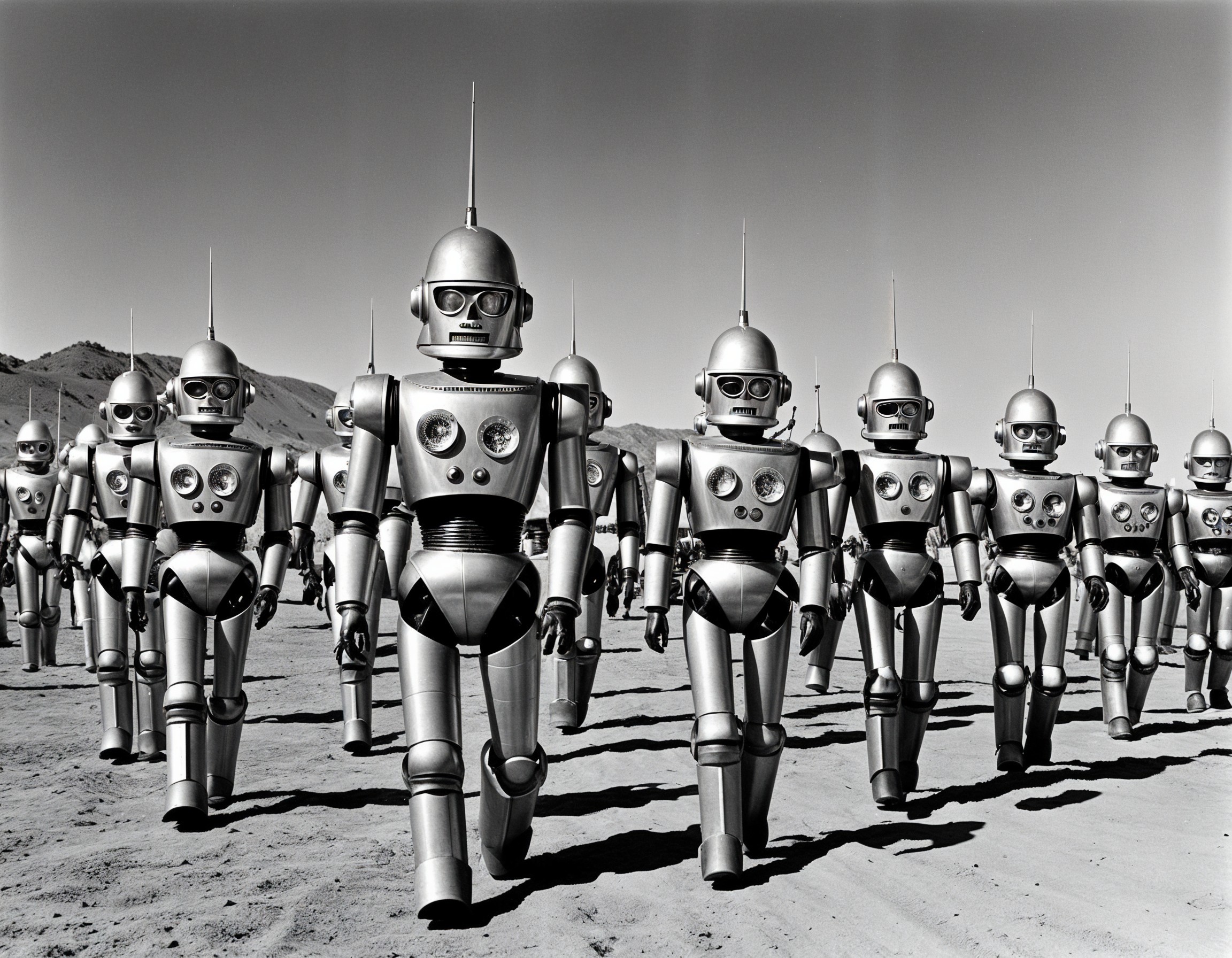 A group of futuristic robots marches confidently across a barren landscape, with flying saucers hovering above. The scene evokes a classic sci-fi atmosphere filled with adventure.