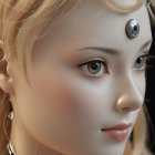A close-up of a lifelike humanoid figure with striking features, including large, expressive eyes and a silver ornament on the forehead. The soft, flowing hair adds an ethereal touch.