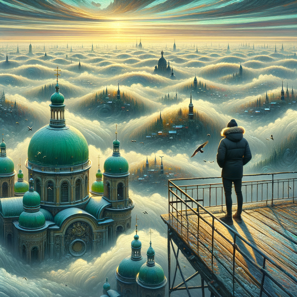 Prompt: "On crispy winter morning the distant city dotted with green domes seemed to be set upon rows of sea of fog.From the top of viewing tower, I took pleasure just gazing at it.
