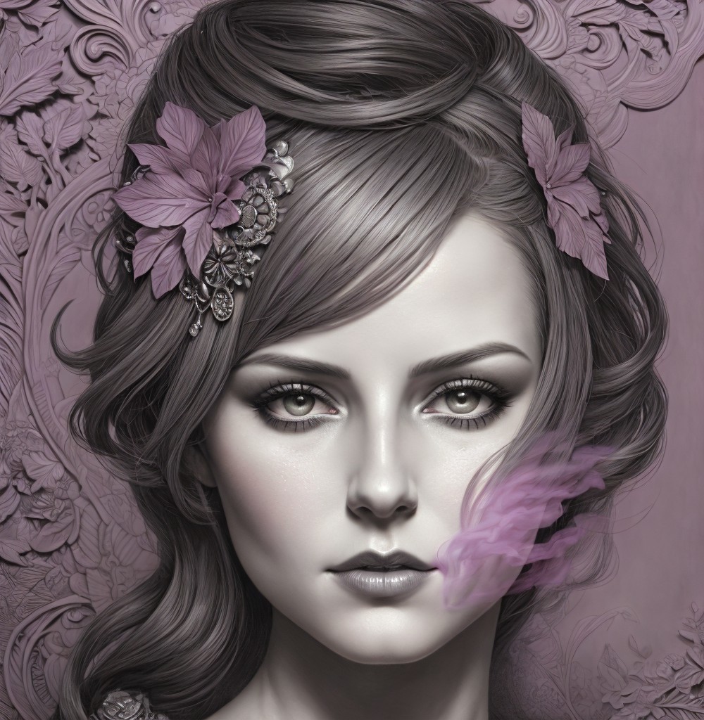 + Prompt:Female ghost made of smoke, charcoal sketch, lithography and ink, close up ,synthetic, Anglocore, Art Nouveau portrait, temptress, masterpiece in the style of Geoff Darrow. fantasy illustration, female head, upper body portrait, background picturesque natural scene with a carved stone as the focal point. Integrate a 3D fractal representation of a woman's body, intricate details . Beautiful composition, very detailed, tints of autochrome photography style ,smooth crackles