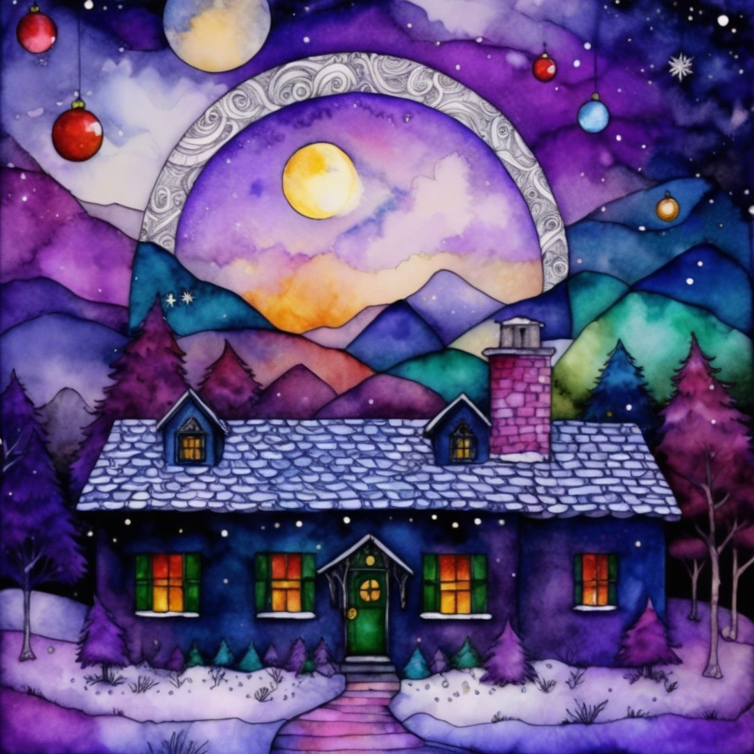 A whimsical, colorful scene featuring a cozy house surrounded by vibrant trees and mountains under a starry sky, adorned with suspended ornaments and a glowing, magical atmosphere.
