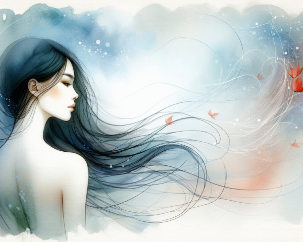 A haunting scene of a dimly lit house surrounded by swirling blue and orange hues. Raindrops and soft light create an ethereal atmosphere, blending mystery with a touch of warmth.