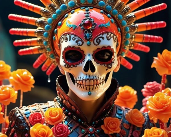 The image features an intricately designed golden box, adorned with ornate patterns and symbols, resting on a colorful, patterned surface against a vibrant, surreal backdrop.