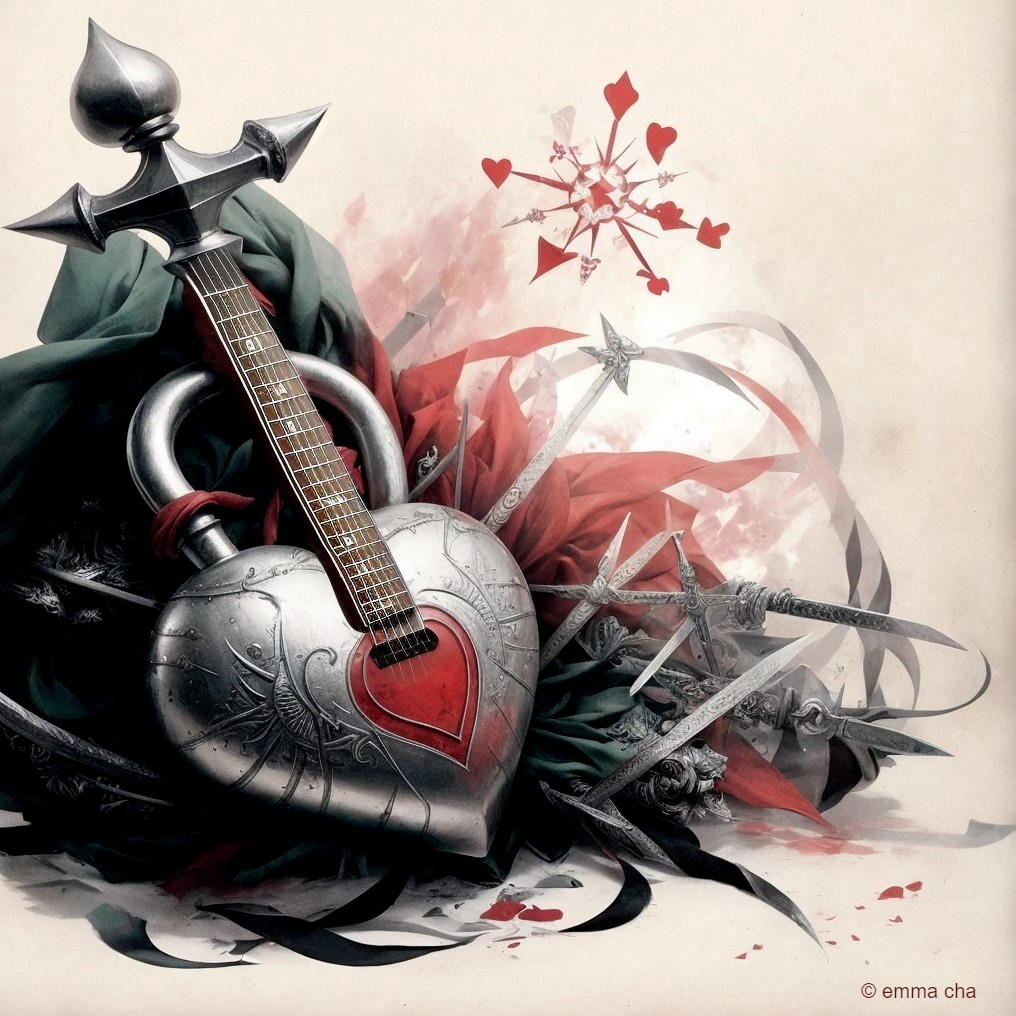 An artistic composition with a heart-shaped armor, guitar, dagger, swirling cloth, and red flowers, evoking themes of love and battle.