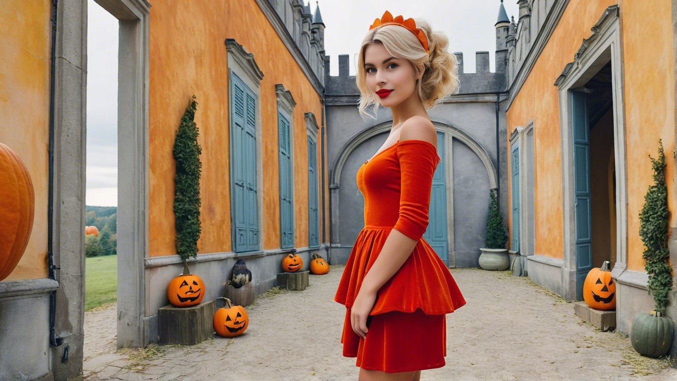 + Prompt:Amelie Elmquist aka Amelea (20yo blonde full body) in a place that also accentuates her beauty it is Halloween and there are pumpkin lanterns and castle use Amelie Elmquist's own style