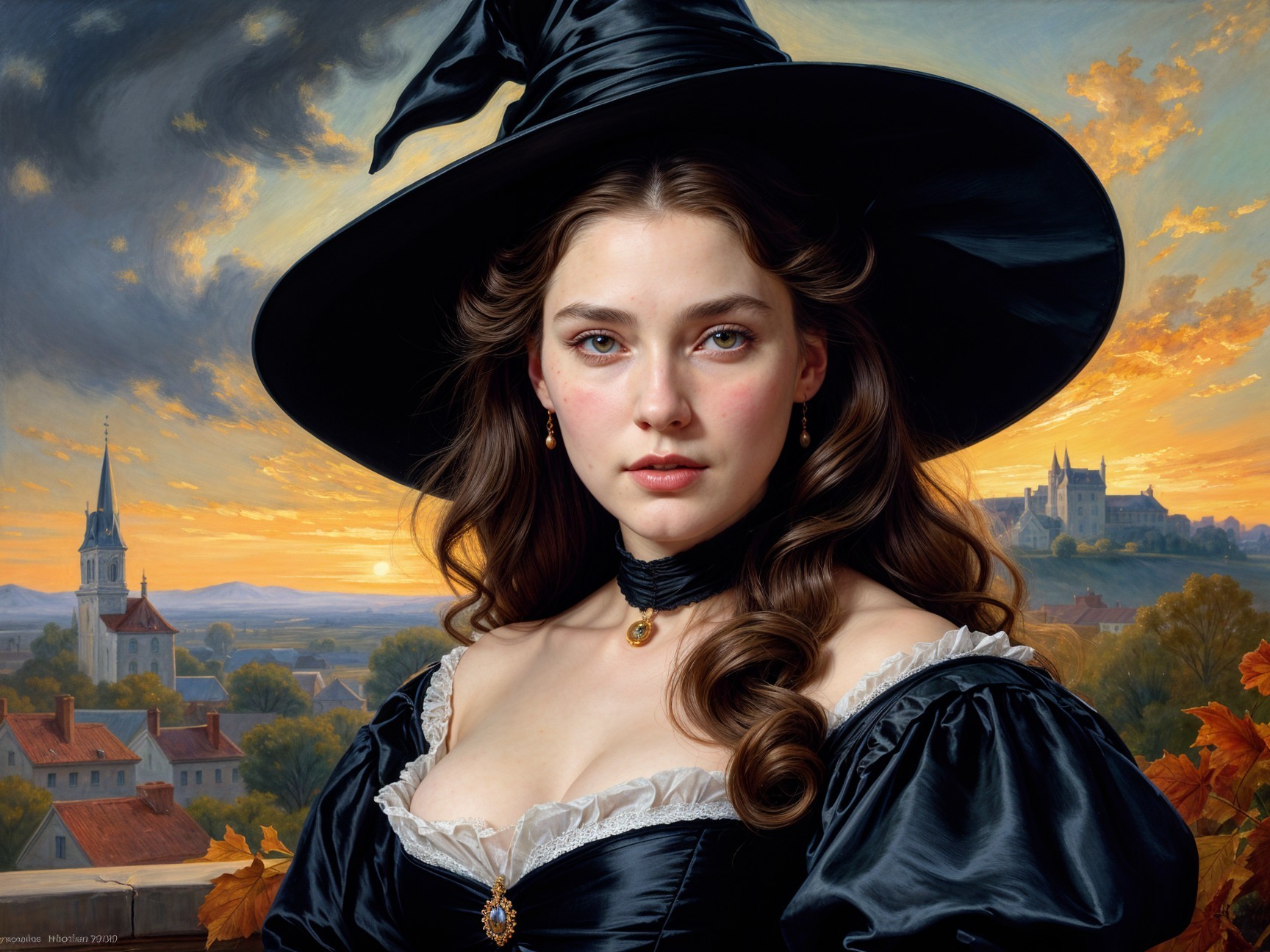 A young woman with long, wavy hair and a dramatic black hat gazes confidently at the viewer. She wears an elegant gown, set against a scenic sunset backdrop with distant buildings and soft clouds.