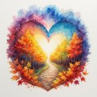 A vibrant heart-shaped scene features a winding path through a colorful forest of autumn trees. Bright skies and soft clouds create a whimsical, dreamlike atmosphere.