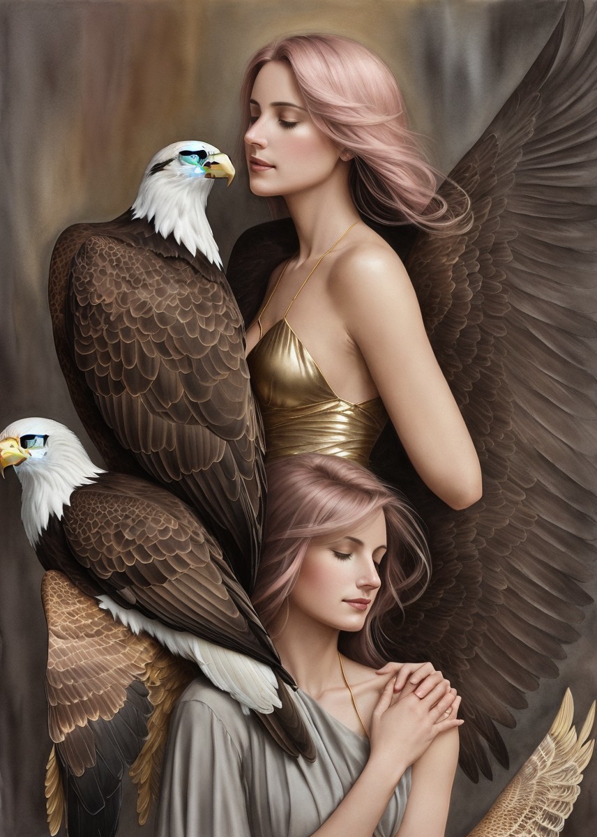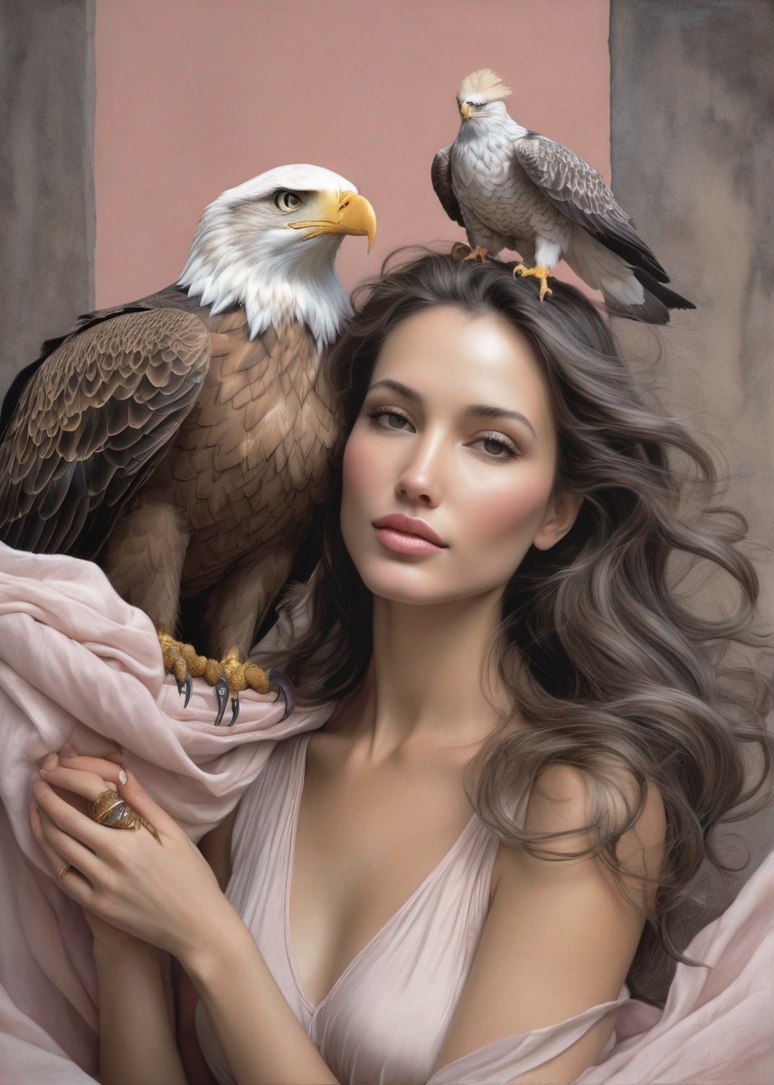 A woman with flowing hair, draped in a pink fabric, sits with a majestic bald eagle perched beside her and a smaller one on her shoulder.