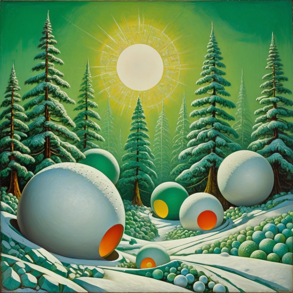 Prompt: Peinture à l'huile à la manière de Max Ernst. Des boules de neige posées dans une pente. Sapins insolites. Grand soleil. Couleurs dominantes vert amande, vert vif et blanc.