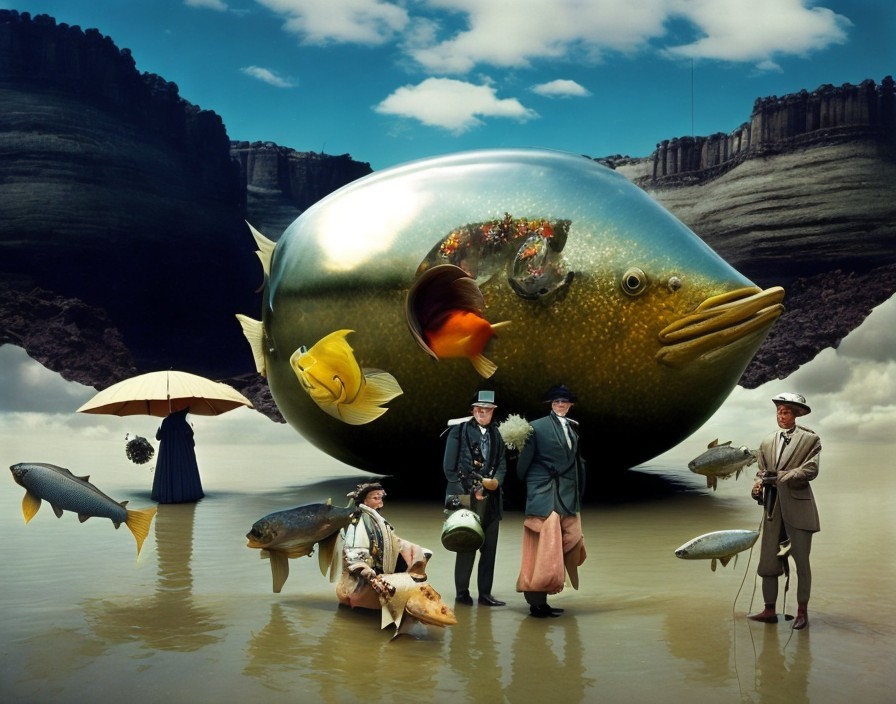 Prompt: "How much is the fish? Surreal dadaist collage of strange people doing strange things in a fantastically weird outlandish landscape, very silly, magical, dada, dadaism, surrealism, Terry Gilliam, Monty Python"