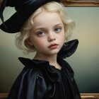 A young girl with soft, curly blonde hair wears a stylish black hat. Her big, expressive blue eyes and rosy cheeks bring a charming innocence to her elegant appearance.