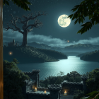 A mystical castle overlooks a serene lake under a starry night sky. Moonlight bathes the landscape, with candles flickering in a quaint wooden room, creating an enchanting atmosphere.