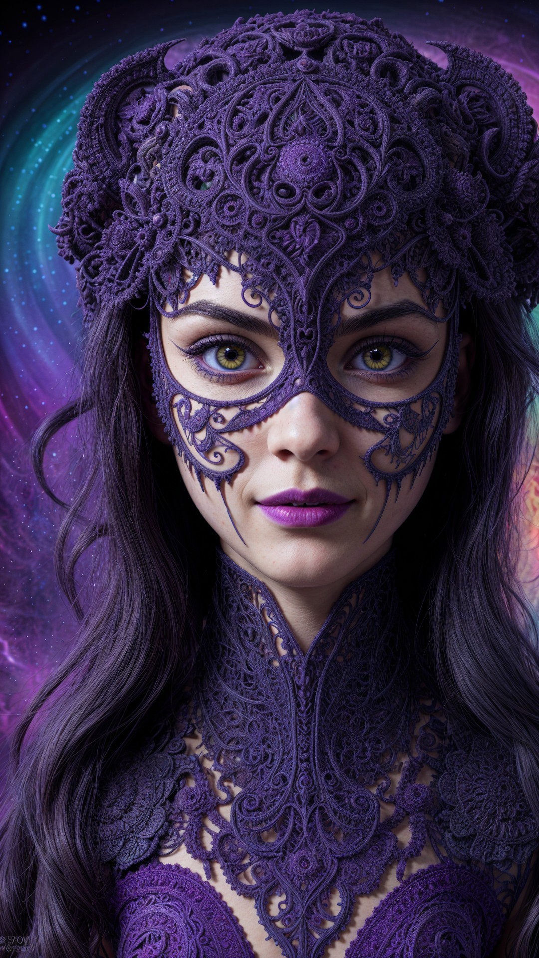 Portrait of a Woman with Violet Lace and Cosmic Background