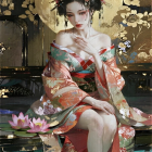A stylish individual sits gracefully on an ornate chair, dressed in a shimmering corset and elegant skirt. The backdrop features lush flowers and opulent decor, creating a dreamy ambiance.