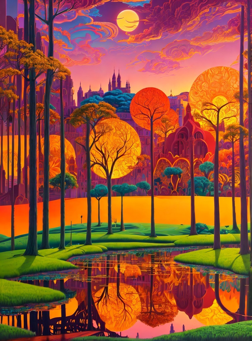 A vibrant surreal landscape features a majestic sun with a serene face, surrounded by colorful trees and fantastical architecture, reflecting beautifully in calm waters under a radiant sky.