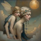 The artwork features two ethereal women, one adorned with a butterfly, against a dreamy backdrop of clouds and a glowing moon, exuding a sense of mystique and beauty.