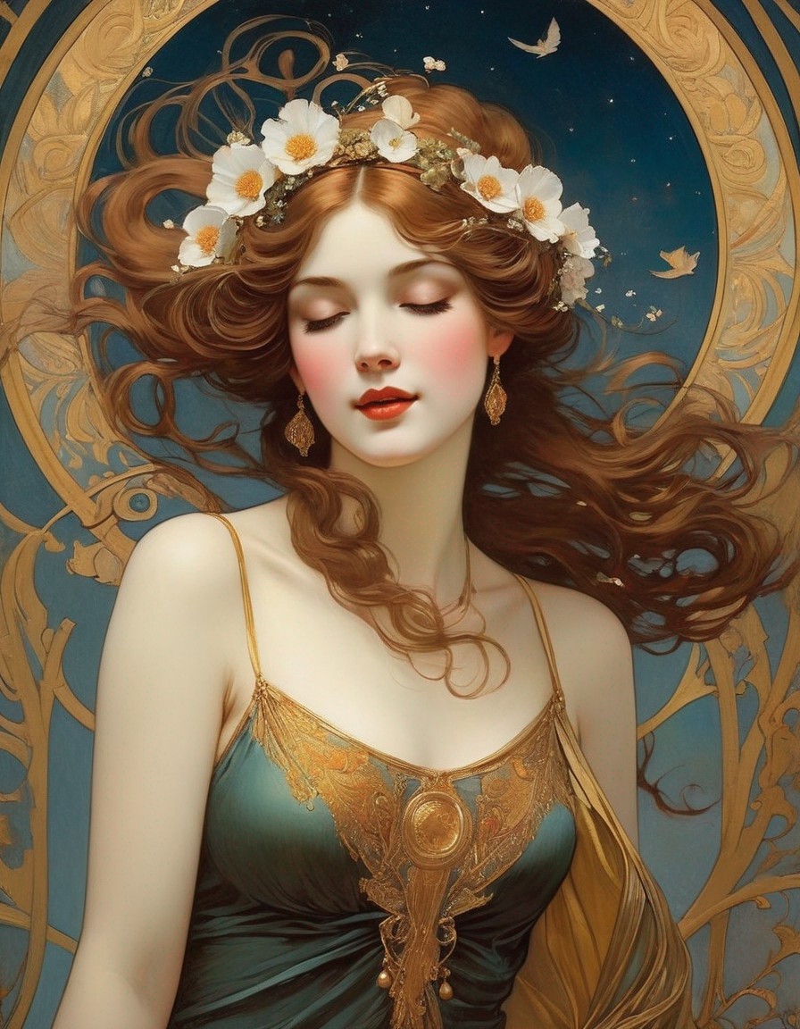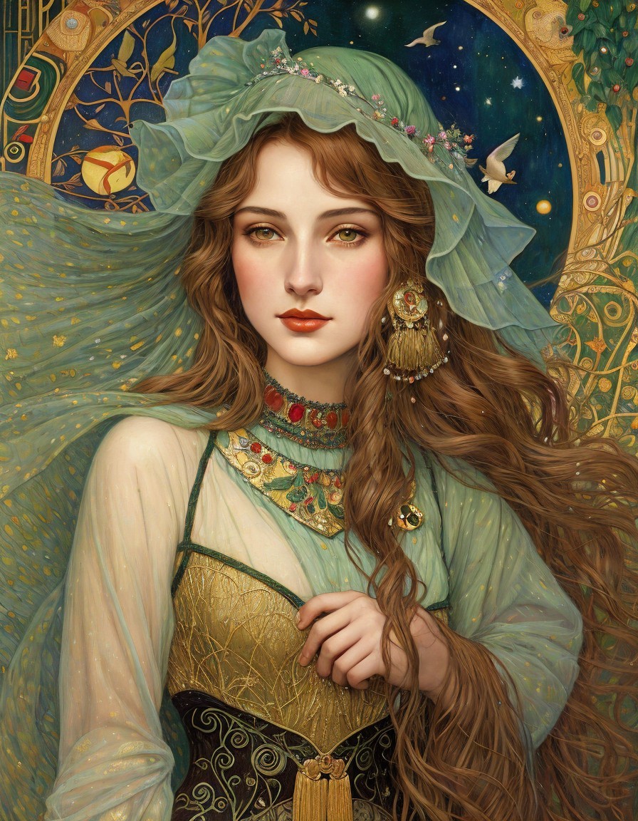 Serene Woman in Teal Gown Against Starry Night