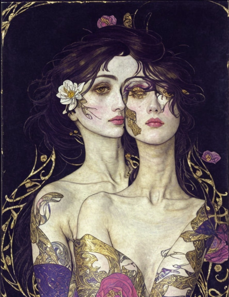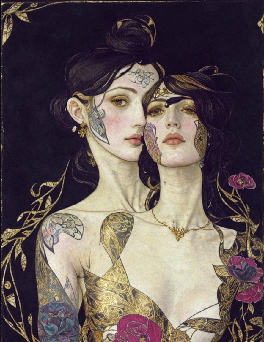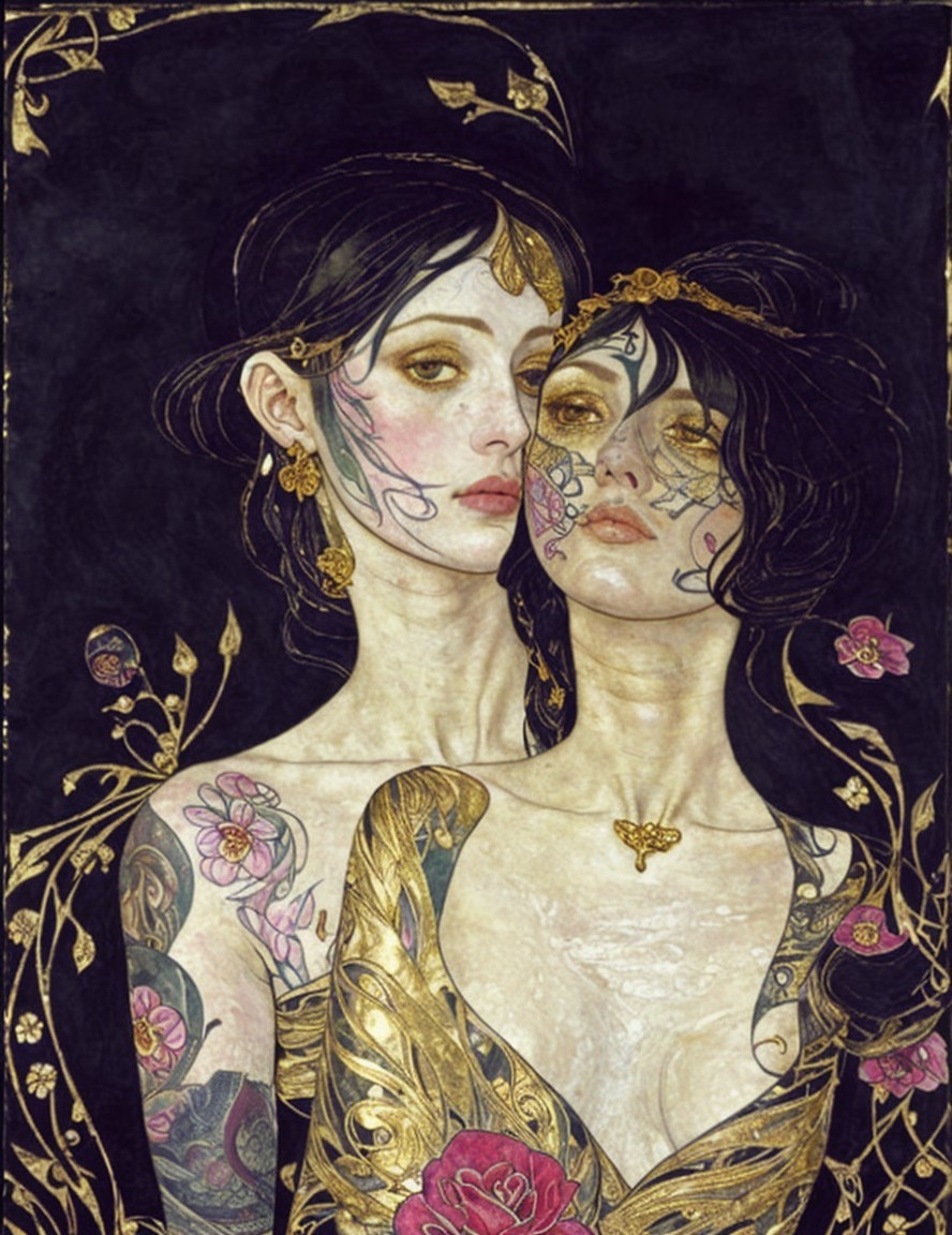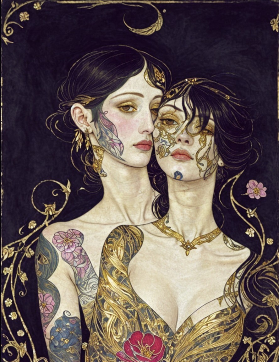 Two women with floral tattoos and ornate attire, depicted in an art nouveau style with a dark background and gold embellishments.