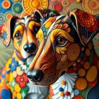 Two vividly painted dogs with expressive eyes sit close together against a colorful, abstract background filled with circles and shapes, showcasing a playful and artistic style.