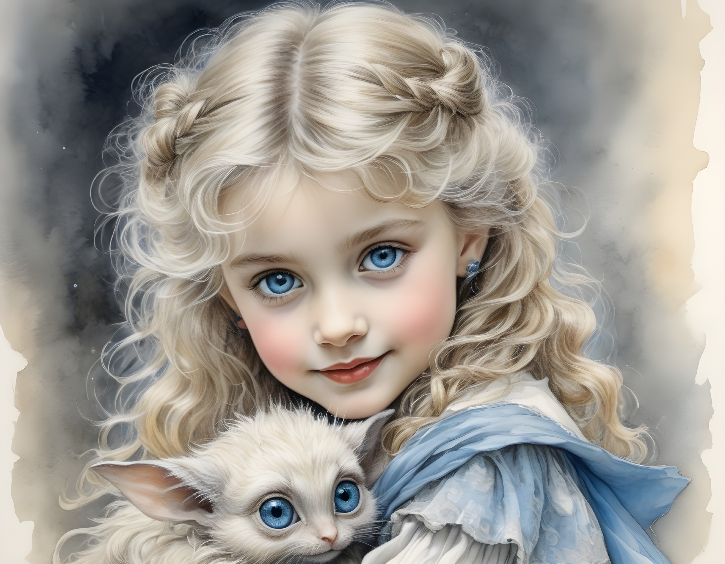 A digital painting of a young girl with curly blonde hair, blue eyes, and rosy cheeks, holding a small kitten with matching blue eyes.