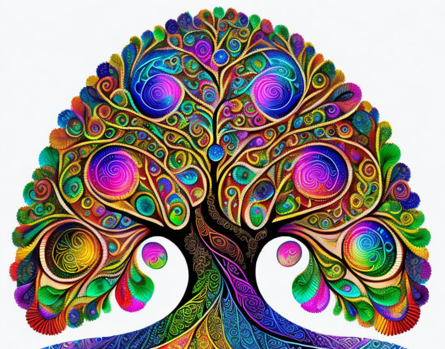 Colorful Tree with Circular Designs on Foliage and Trunk on White Background