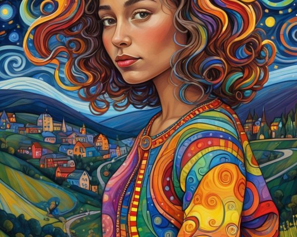 A young woman kneels at a wooden table, playfully working with yellow dough. Behind her, an impressionistic painting of a girl with similar features adds to the creative atmosphere in the studio.