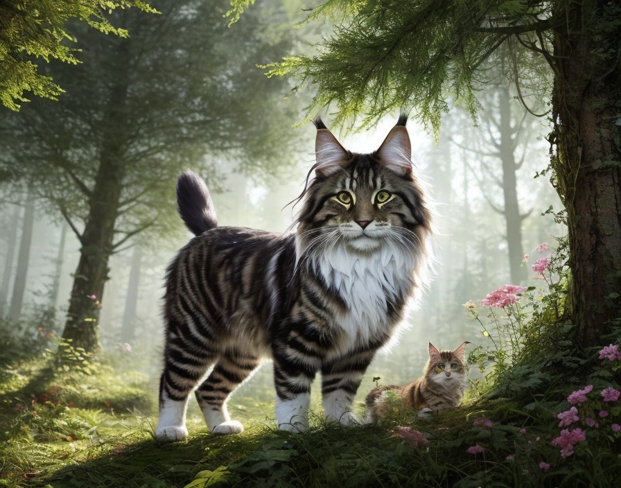 Prompt: "A whimsical forestscape featuring a joyful Maine Coon, fluffy and cute, painted in a Speedpaint style by Ernst Haeckel and Ismail Inceoglu. Mix of large and medium brush strokes, paint splatters, and drips by Gazelli and Robert Oxley. A masterpiece with correct proportions, 8k resolution, highly detailed and intricate. Trending on ArtStation, blending Aquarelle painting with the style of Thomas Wells Schaller."