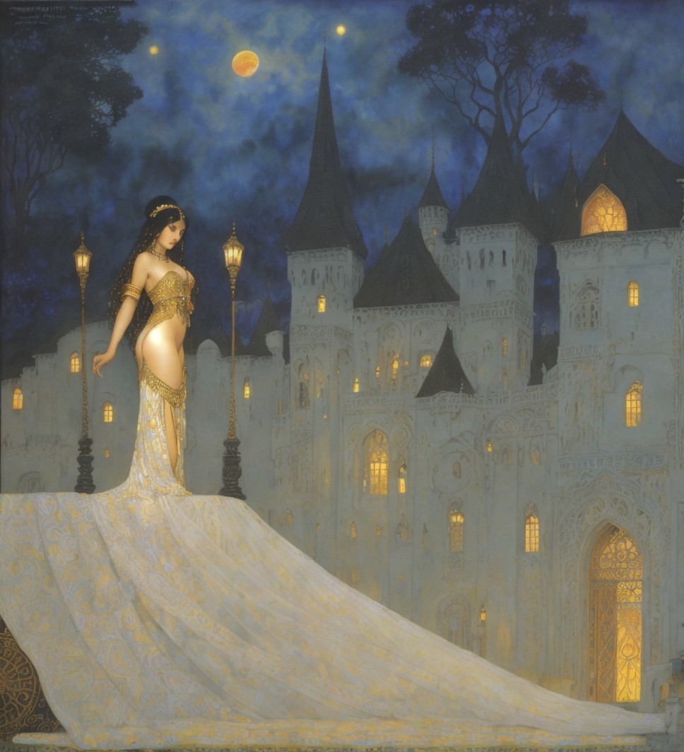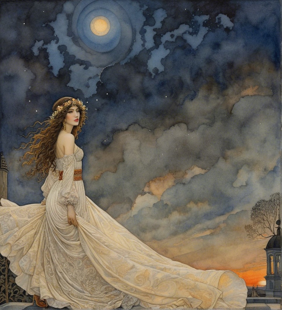 A majestic woman in an elegant white dress gazes over a dramatic sunset. The sky is filled with swirling clouds and a bright moon, creating a captivating, ethereal scene.