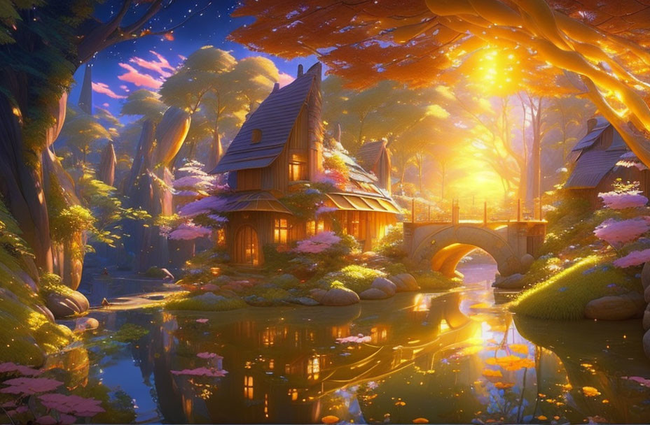 Enchanting fantasy cottage nestled in autumn forest with mushrooms and pond