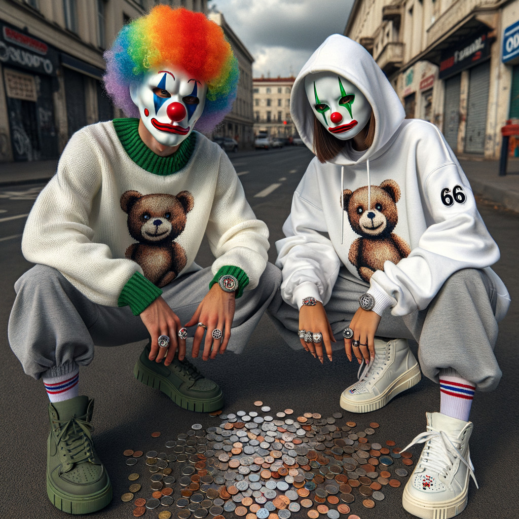 Two people with clown makeup are squatting on a street, wearing oversized hoodies with teddy bear prints and flaunting chunky sneakers and colorful socks.