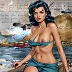 A stunning woman in a red swimsuit poses against a vibrant beach scene, with crashing waves and boats in the background, capturing the essence of a lively coastal paradise.