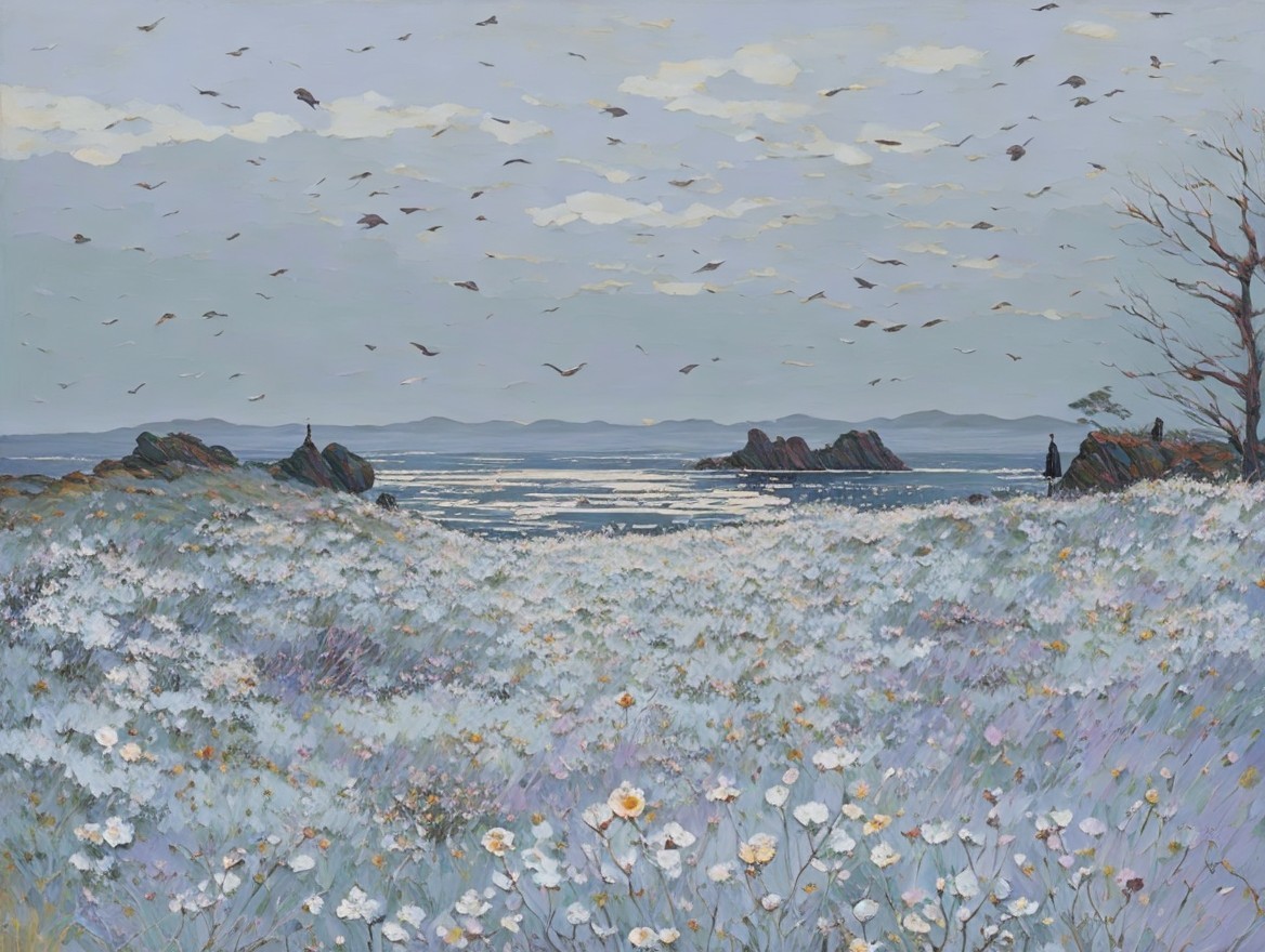 Tranquil landscape with flowers, figure, sea, birds, and clouds