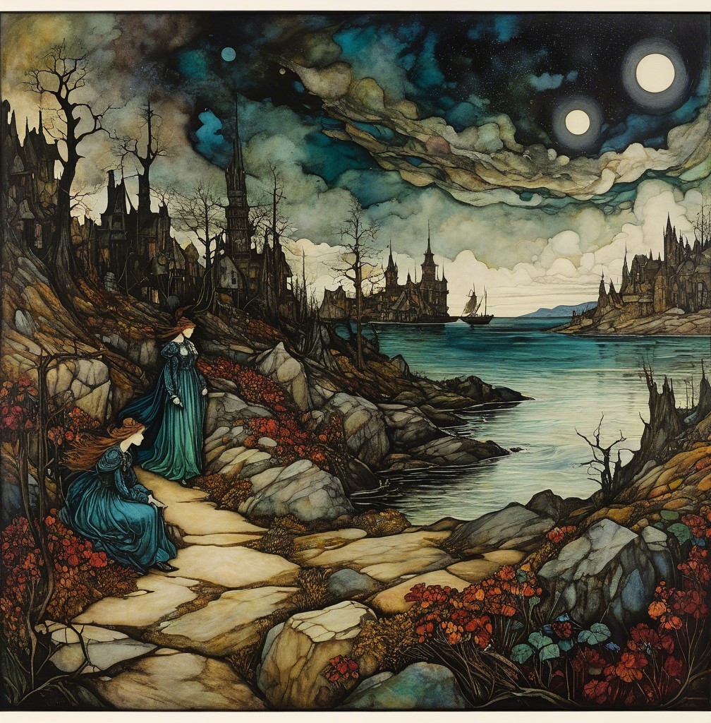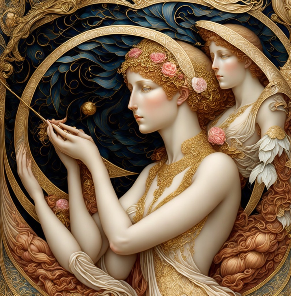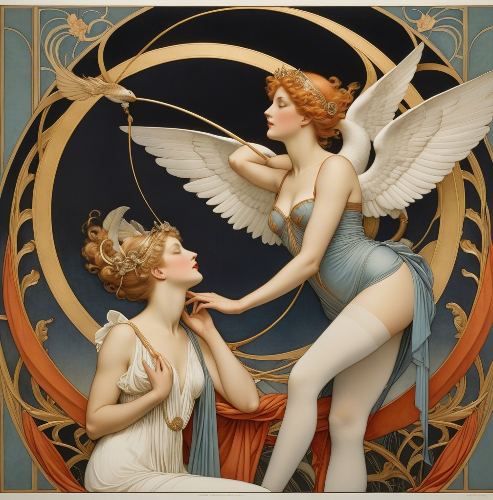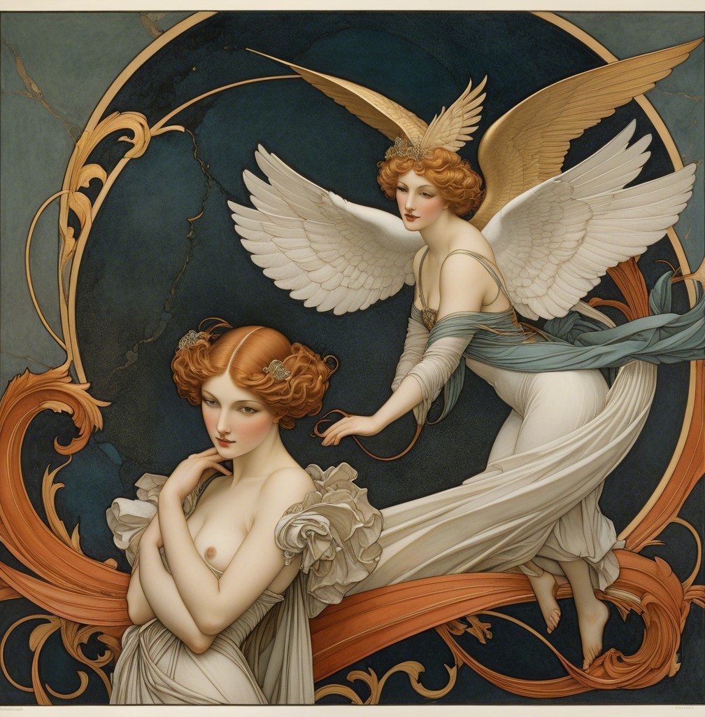 A graceful woman with flowing red hair and angelic wings cradles a rose and an orange, framed by ornate, swirling patterns against a deep black background, embodying beauty and serenity.