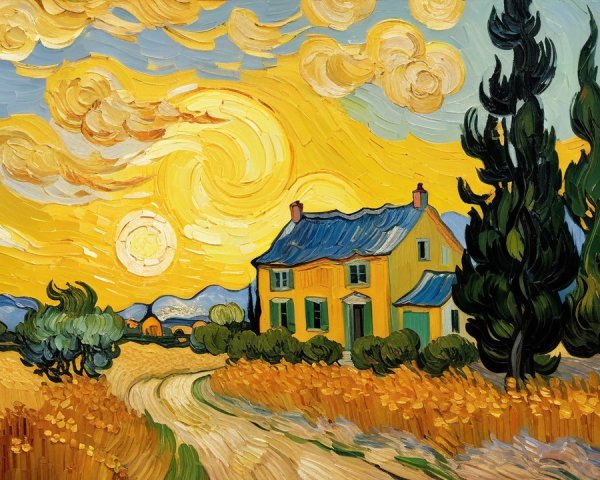 An impressionistic oil painting depicts a vibrant green and yellow house with green shutters and an orange roof nestled on a sandy dune overlooking a choppy turquoise and deep blue ocean. The sunlight, created from yellow cloud-like strokes, casts a bright reflection on the wavy water, with white foam dotting the crest