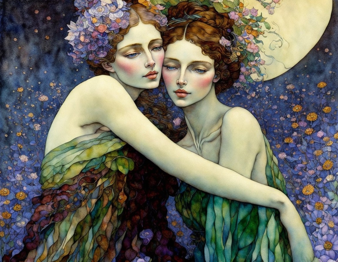 Two women with stylized features embrace against a celestial backdrop, with a large moon and stars, adorned with flowers and elegant attire.