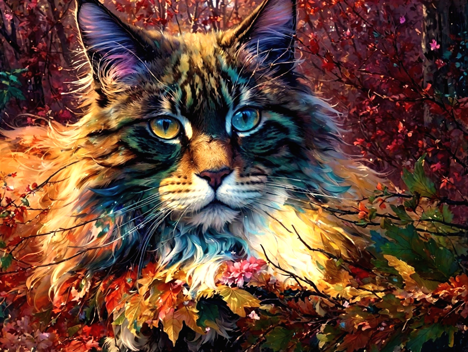 A vividly colored artwork of a majestic long-haired cat set against an autumnal backdrop of red, orange, and yellow foliage.