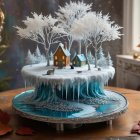 A diorama crafted from an open book, depicting a fantasy literary landscape on a rustic wooden table. The diorama shows a lush green illuminated jungle with a vibrant turquoise-blue waterfall flowing into a river on a page of the book. A wooden staircase leads to a small bridge overlooking the river, with