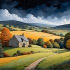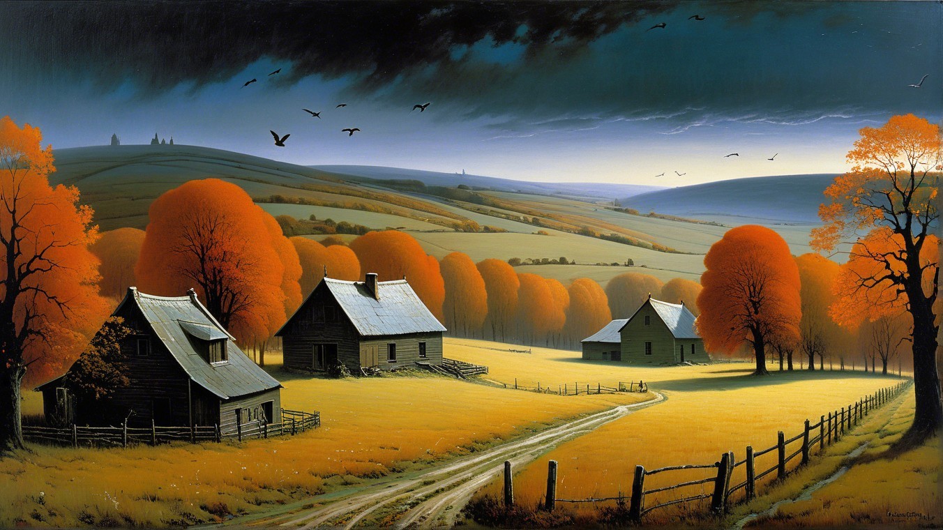 A tranquil scene unfolds with a silhouette of a house surrounded by leafless trees under a glowing full moon. Shadows stretch across a golden field, evoking a sense of calm and mystery.