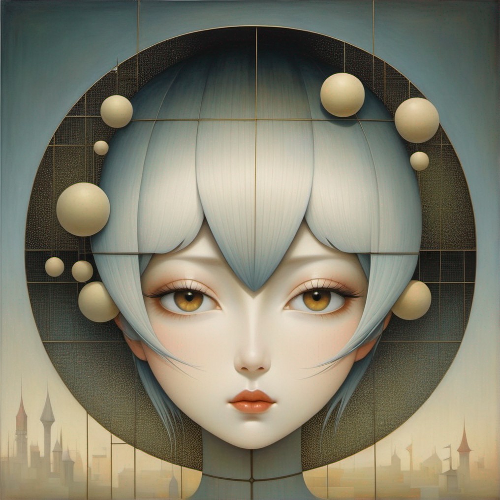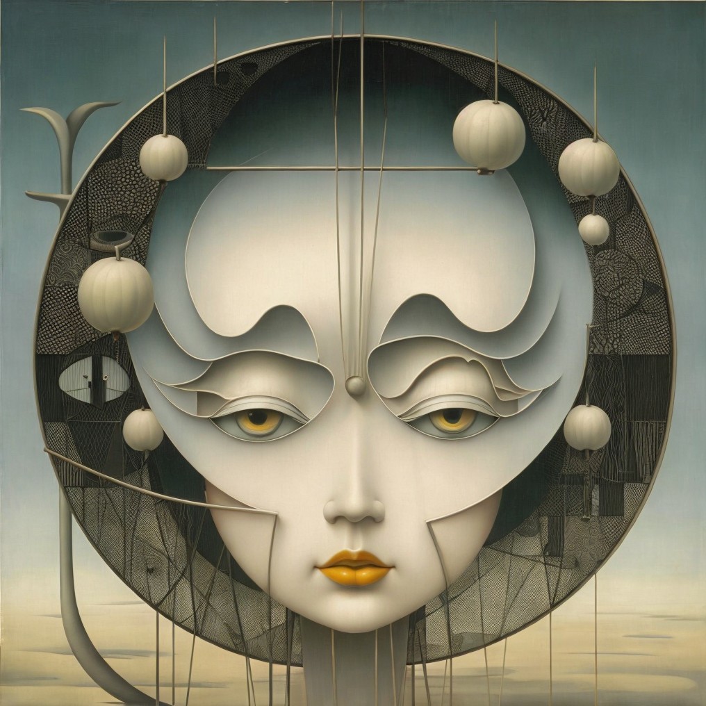 Surreal artwork of a stylized female face with intricate patterns, geometric shapes, and muted colors.