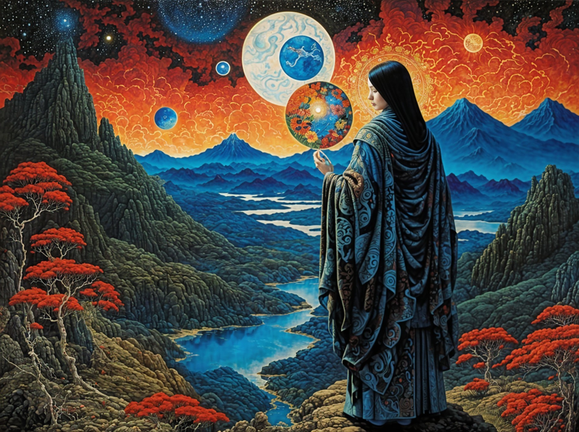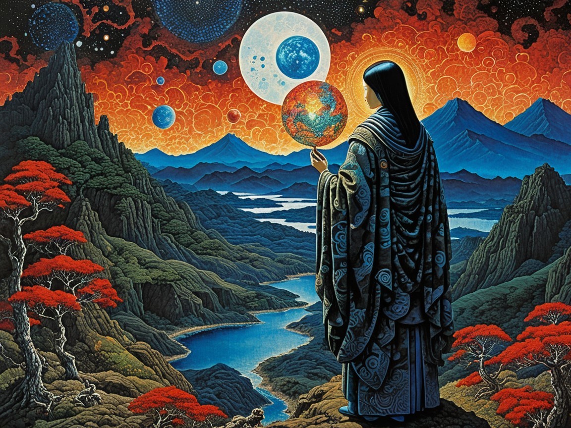 (Try from garicten) - A figure draped in a patterned robe stands by a serene river, holding a glowing orb that depicts a vibrant Earth. Surrounded by otherworldly landscapes and celestial bodies, the scene evokes cosmic wonder.