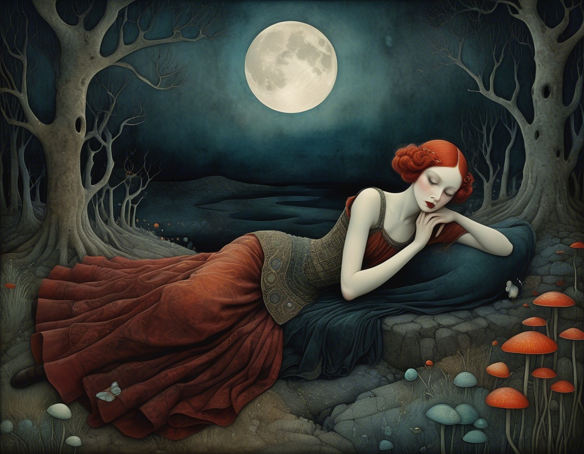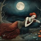 A poised woman reclines on an ornate couch, draped in a rich, flowing gown of deep reds and greens, surrounded by vibrant fabrics and an intricate artwork in the background.
