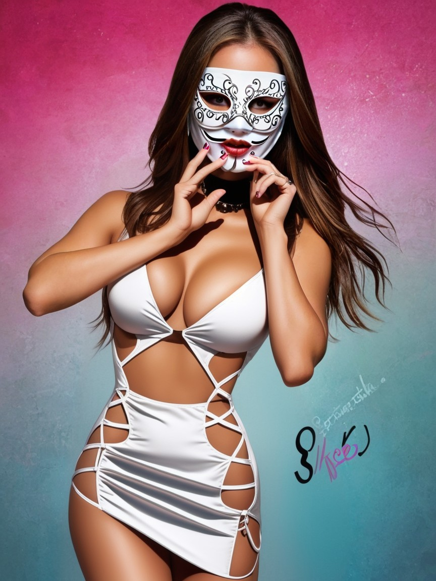 A woman poses wearing an ornate black-and-white mask, her long hair cascading down. She playfully touches the mask, set against a vibrant pink gradient background.